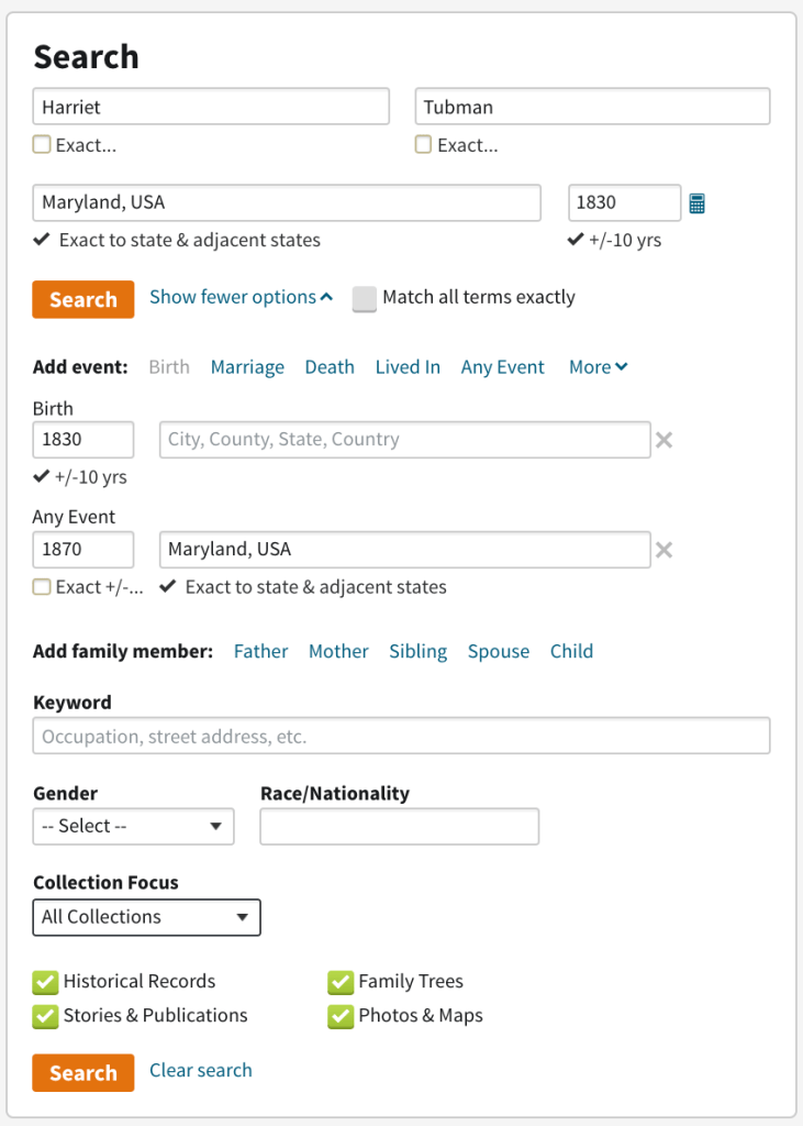 For me, the minimum requirement for starting a new census search is to answer the questions: 1) Who was s/he?; 2) Where was s/he?; and 3) Whose is s/he? In other words, one should know a person’s name and approximate age; place of residence; and the names of parents, siblings or other relatives with whom they lived. If I have this information, I can trust my initial findings more confidently. Even if I don’t have all of these details, there is still hope! Always, you can make some informed hypotheses about a given subject and save the possibilities for a time when you can refine your guesses with information you may gather later. For example, let’s say I want to know more about the titular character of a movie we watched recently – Harriet (Chase, Lundberg, & Howard, 2019). Who was she? Off the top of my head, I know she went by Harriet Tubman (though her given forename was Araminta or Minty…I have forgotten her previously used surname) and was probably born around the 1830’s (I think she was in her 30’s when she escaped from her slaveowner prior to the Civil War). Where was she? I believe Ms. Tubman lived in the northeast U.S., probably in Virginia, Maryland, or D.C. area, before moving to Canada for a while. Enslaved people who secured their freedom as a result of the Civil War did not appear named in the census records until 1870; Harriet found freedom before then, but since I’m not sure of the year she ran away, I will look for her first in 1870. I don’t remember any of her relatives’ names off the top of my head, but I remember from the movie that she worked for a family as a servant and collaborated with Black people in the area who had means and practiced trades.