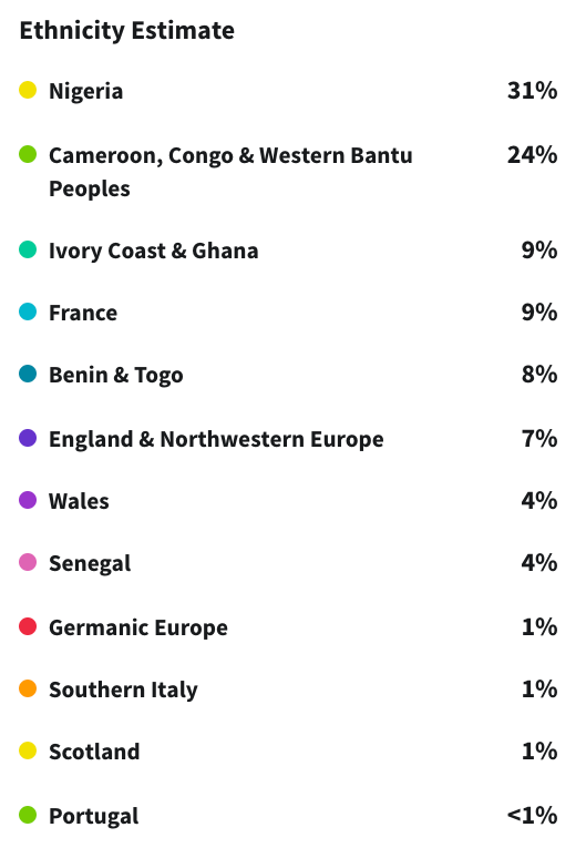 I ordered my first DNA test kit about five years ago. I don’t think I knew exactly what to expect, but I had some ideas. Prior to taking the test, I had presumed that I had Senegalese heritage because of reports that most of America’s slaves had come from West Africa and that many of Louisiana’s slaves had come from Senegal. One of my deceased cousins was named Ebo, which hinted at African heritage related to the Igbo tribe of Nigeria. In terms of my Old World roots, I figured that I had British and French ancestry. My great grand-mother Ida was very fair-skinned, and her maternal grandfather was one of the prominent, Cajun Guilbeau men in the Lafayette, Louisiana area. My dad’s great-grandfather was a white man whose family was reputed to have originated in Shropshire, England before settling in Virginia. My genealogy research on several other family lines gave me good reason to guess that I was at least 16% white, and that was before DNA testing became widely available to the masses.