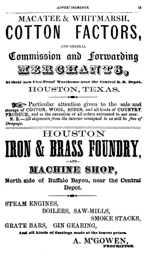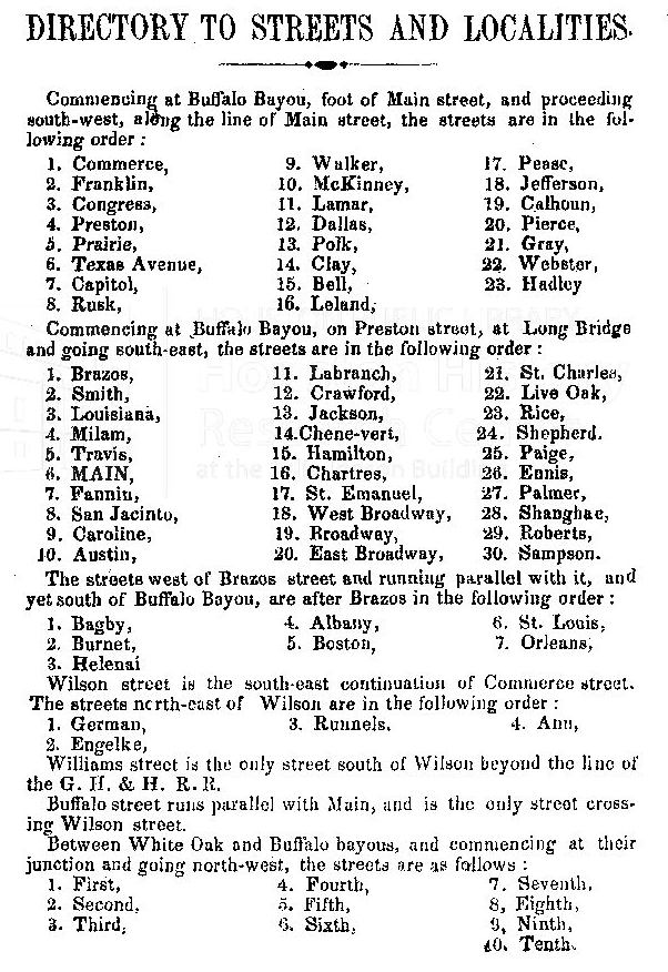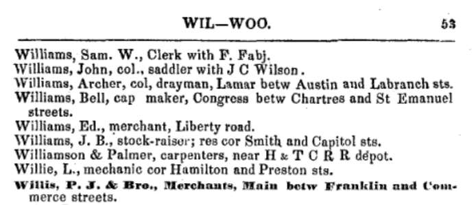 [1] W.A. Leonard, compiler, Houston city directory for 1866 (Baltimore: Gray, Strickland, and Co., 1866), viewed on Houston Public Library Digital Archives (https://cdm17006.contentdm.oclc.org/digital/collection/citydir/id/15734/rec/2 : 10 December 2024).