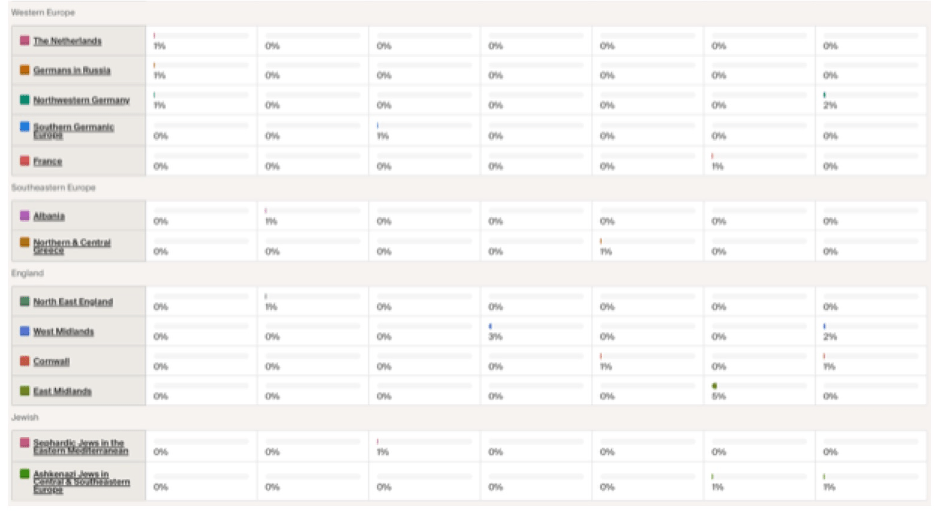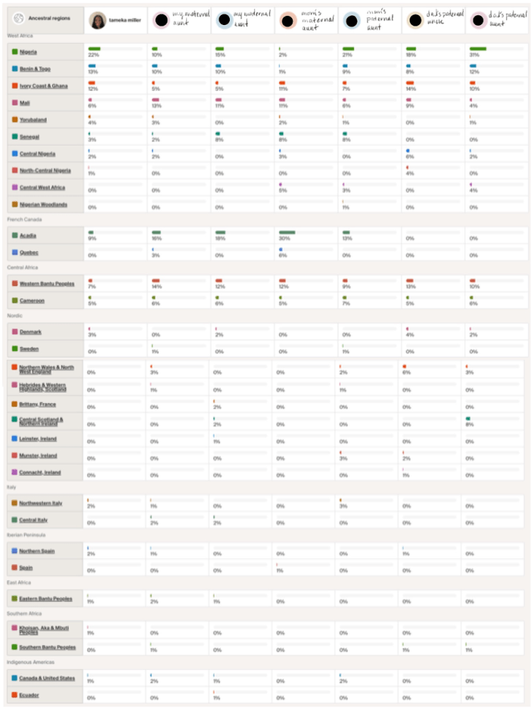 AncestryDNA has a cool feature that enables you to compare your people side by side, offering you a more comprehensive view of your geographical origins and giving you an idea of which families might contribute to your ethnicity estimates. Since both of my parents are deceased and I don’t have any biological siblings, it has been super helpful for me to look at the data of my aunts and uncles who have taken the tests. I compared my data with the data of two of my mother’s sisters and two of her aunts, one maternal and one paternal (columns 3-6); I also compared my data with that of one of my dad’s paternal aunts and one of his paternal uncles (the last two columns, sorry about the blurriness!).